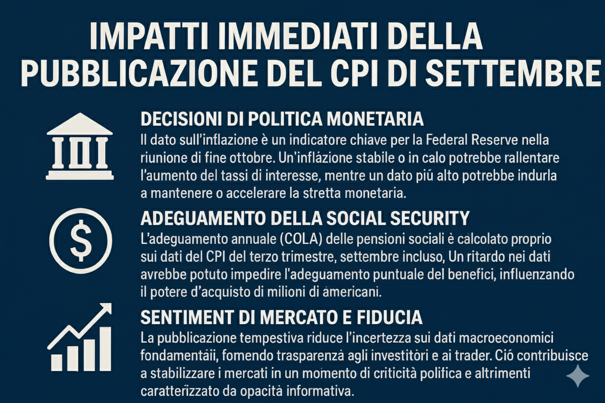 La pubblicazione dell'inflazione USA di settembre, pur essendo un gesto tecnico, avrà valenza simbolica e politica: servirà a evitare disguidi nei pagamenti della Social Security, ma anche a fornire alla Federal Reserve uno degli ultimi tasselli informativi prima della riunione di fine mese. In un contesto di incertezza economica e instabilità istituzionale, l’inflazione USA di settembre diventa molto più di un semplice numero: è l’ago della bussola per chi, giorno dopo giorno, deve orientare la rotta della prima economia mondiale.