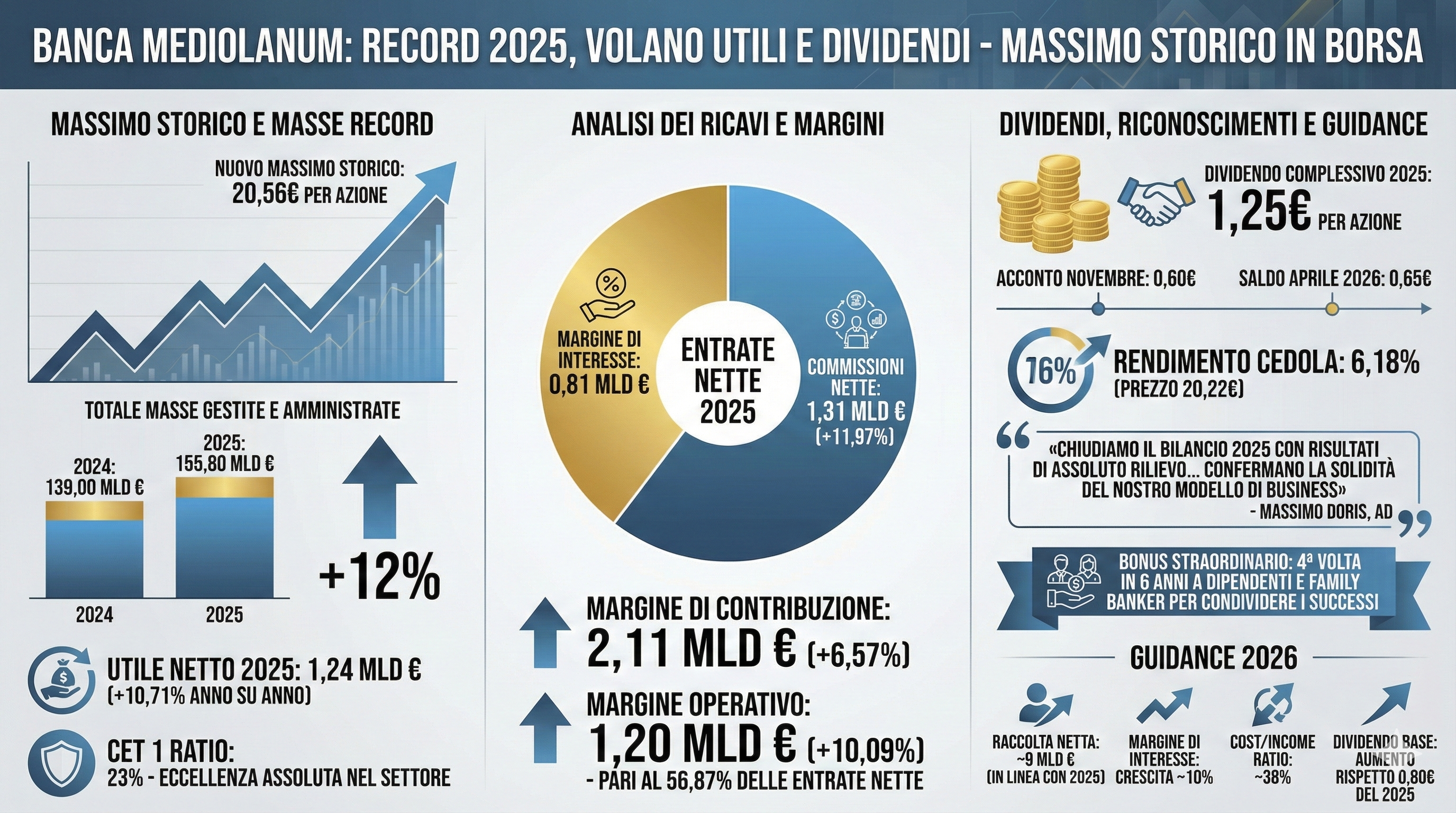 Le azioni Banca Mediolanum oggi hanno raggiunto un nuovo massimo storico a 20,56 euro dopo che l’istituto di credito lombardo ha presentato i conti finanziari del 2025. L’azienda ha chiuso l’anno con livelli record di masse gestite e amministrate e con un balzo di circa 11 punti percentuali dell’utile netto. Forte dei risultati eccellenti, il Consiglio di amministrazione ha deliberato dividendi per circa 924 milioni di euro, il 25% in più rispetto ai livelli del 2024.