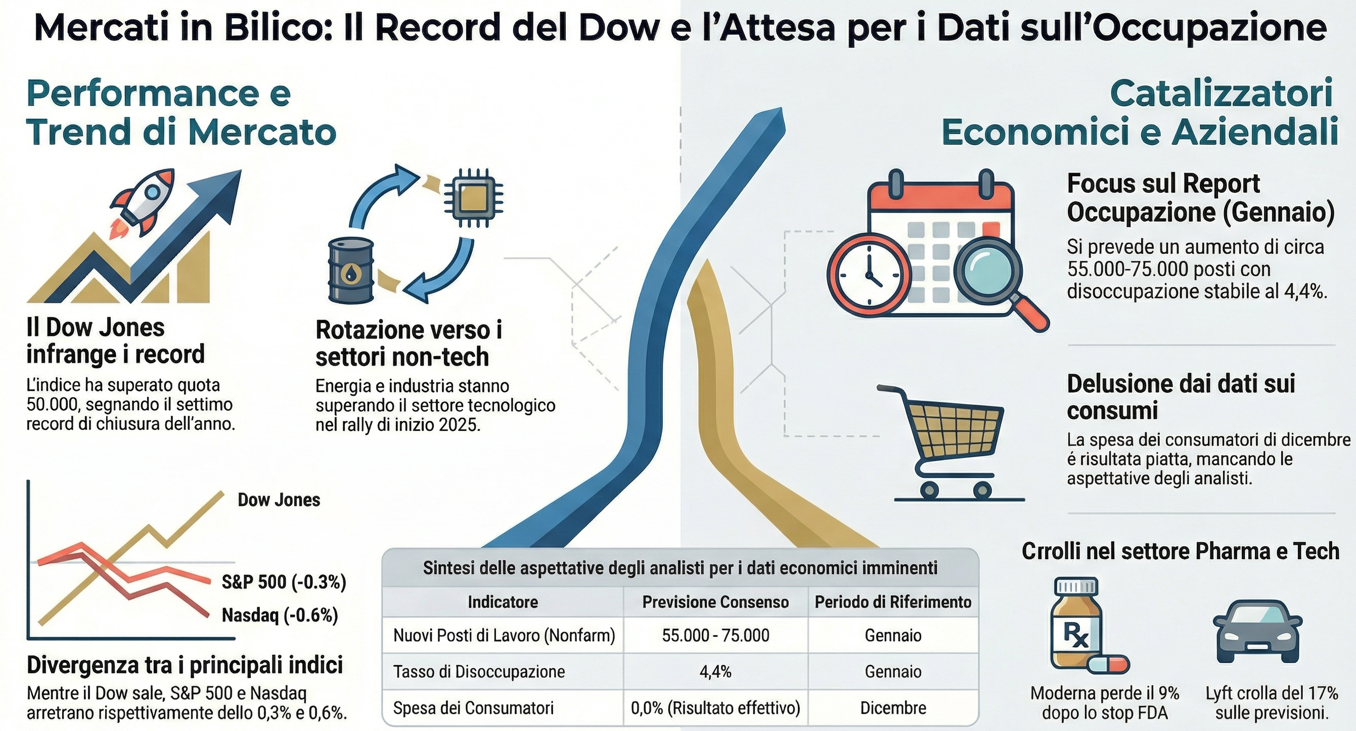 Tuttavia, l'attenzione odierna degli operatori a Wall Street è interamente catalizzata dal ritardato report sull'occupazione di gennaio (Nonfarm Payrolls), la cui pubblicazione è stata posticipata a causa del recente shutdown governativo parziale. Il clima è di "wait and see", con una palpabile tensione derivante dai dati deludenti sulle vendite al dettaglio rilasciati ieri e da una spesa dei consumatori piatta a dicembre.