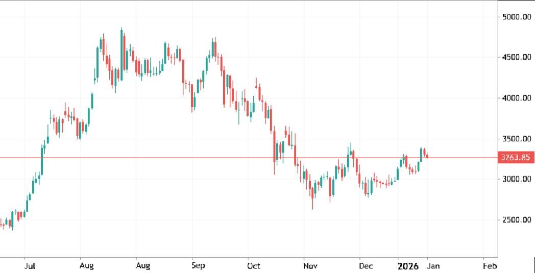 Andando prima su Ethereum, la mia previsione sembra prendere corpo in questi ultimi giorni. L’ennesimo tentativo di scavalcare i massimi di dicembre innescati dal rimbalzo post crollo non ha prodotto nulla più che un retest prima di una nuova correzione. Evidente come tra 3.300 e 3.500 dollari si annidi una resistenza significativa che sta svolgendo un eccellente lavoro di contenimento.