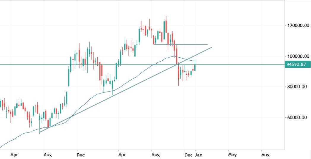 Per quello che riguarda Bitcoin, il quadro non è tanto differente. Pull back sui massimi di dicembre completato in area 95.000 USD, ma siamo ancora sotto la media mobile a 1 anno in un contesto di oscillatori che si stanno gradualmente normalizzando dopo gli eccessi di ipervenduto delle scorse settimane.