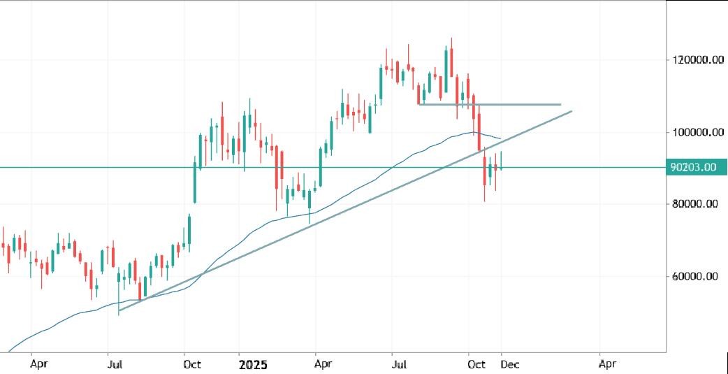 Per quello che riguarda Bitcoin, il contesto è analogo e anche qui è impressionante la precisione tecnica con cui il mercato, violata la media a 1 anno che sosteneva da tempo il bull market, è andato a colpire i supporti di 80k.