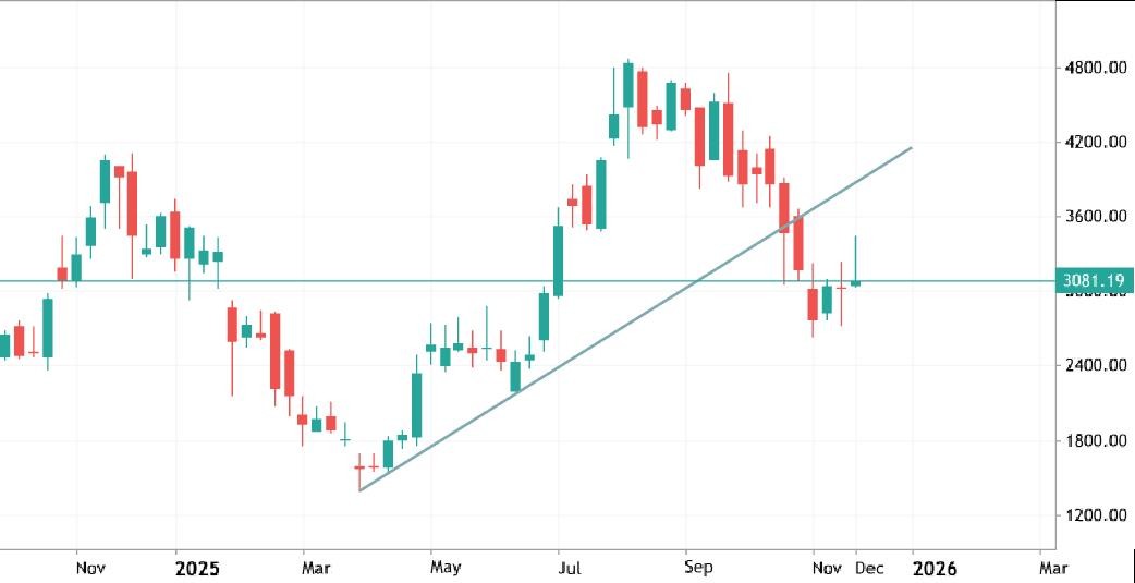 Tendenzialmente mi piace lavorare sulle prolungate fasi di accumulazione e sarebbe interessante una nuova discesa sui minimi di 2.700 (senza violazione ribassista), per entrare con una maggiore convinzione tecnica su Ethereum. La figura di shooting star settimanale con cui si è chiusa l'ottava precedente sembra preludere ad un nuovo movimento verso il basso.