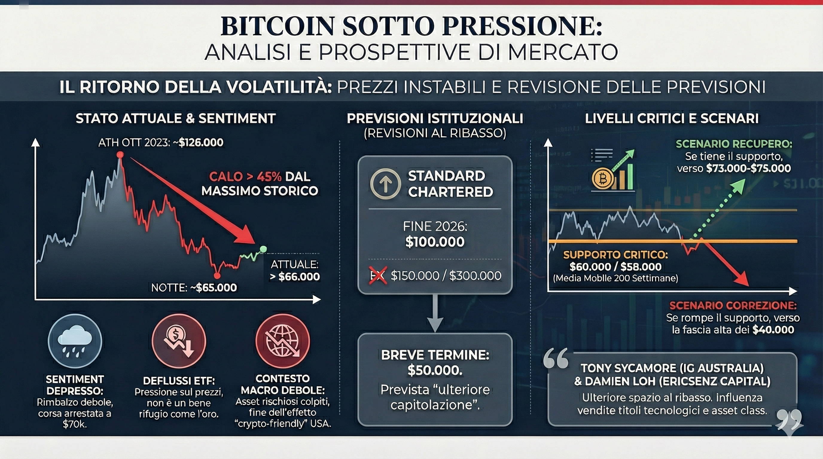 Bitcoin si stabilizza sopra 66.000 dollari, ma il sentiment resta debole. Standard Chartered rivede le stime e fissa un target particolarmente basso