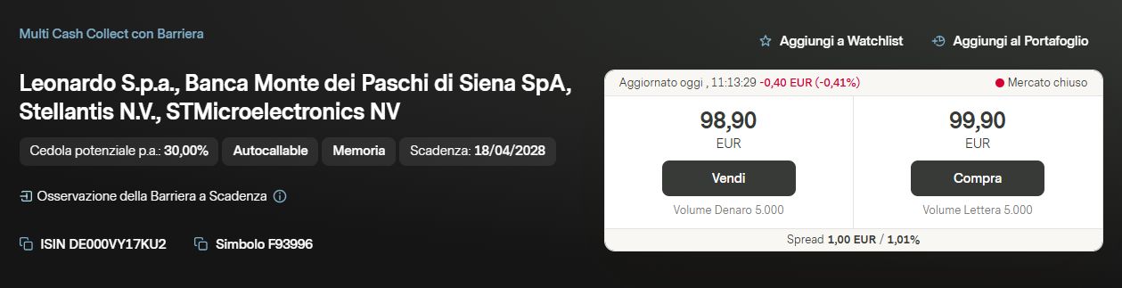La protezione del capitale è subordinata al rispetto della barriera, fissata al 60% dei livelli iniziali dei singoli sottostanti e osservata esclusivamente a scadenza. Ciò significa che durante la vita del prodotto le oscillazioni dei sottostanti non hanno impatto diretto sulla protezione del capitale, a meno che non si arrivi alla data finale. In particolare, la barriera è posta a 35,35 euro per Leonardo, 5,418 euro per Banca Monte dei Paschi di Siena, 4,272 euro per Stellantis e 21,408 euro per STMicroelectronics.