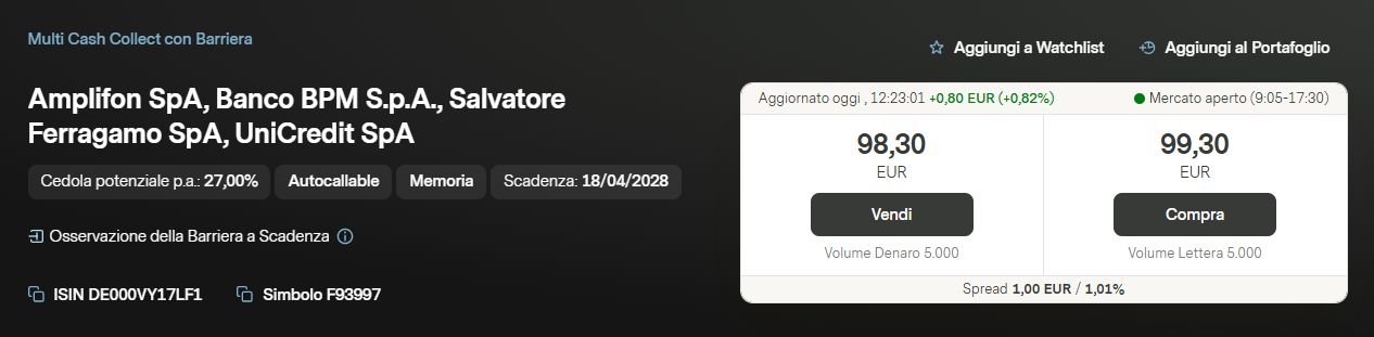 Le barriere sono fissate a 6,141 euro per Amplifon, 7,992 euro per Banco BPM, 4,776 euro per Salvatore Ferragamo e 41,66 euro per UniCredit. Se alla scadenza tutti i sottostanti si troveranno sopra la barriera, il certificato rimborserà il valore nominale insieme all’ultima eventuale cedola.