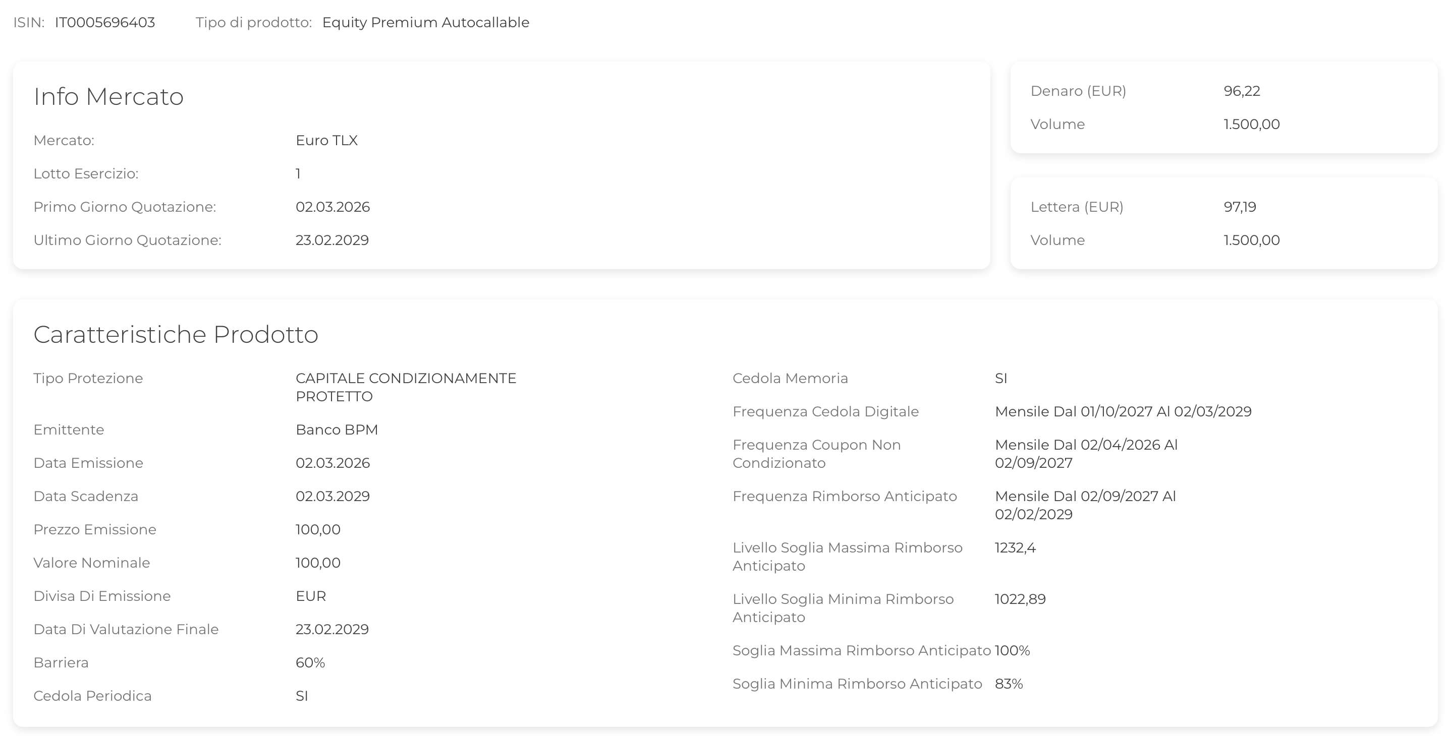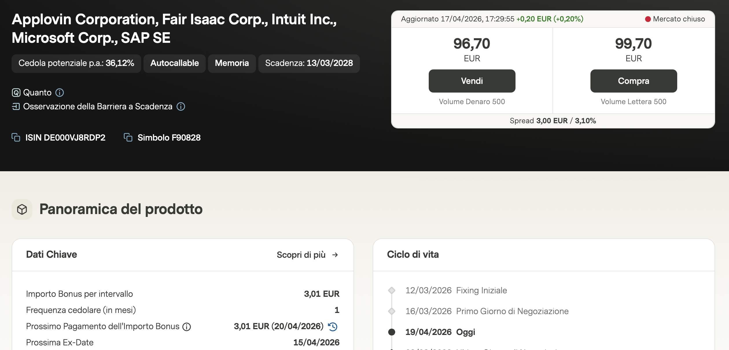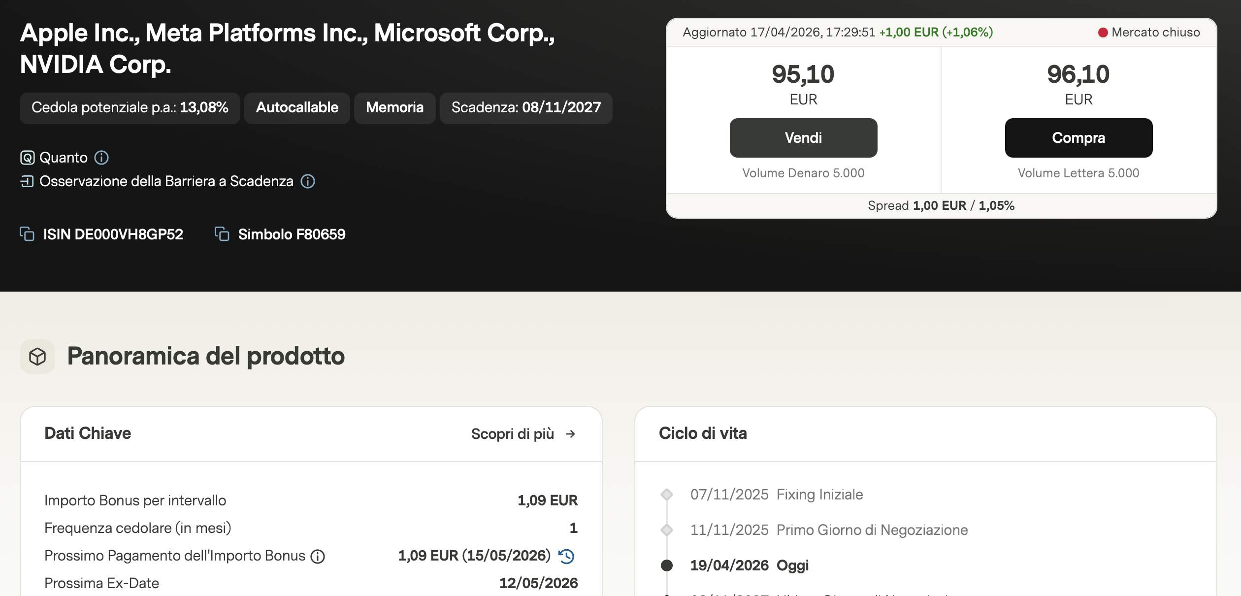Gran parte dei timori degli analisti riguarda gli accordi con OpenAI, ma la diversificazione di Microsoft tra Azure, Office e il comparto Cloud suggerisce che l'attuale calo sia un'opportunità di acquisto simile a quella vista su Nvidia nel 2022. Il certificato si acquista a circa 96,10 e offre una cedola di 1,09€, promettendo quindi anche un extra rendimento a scadenza.
