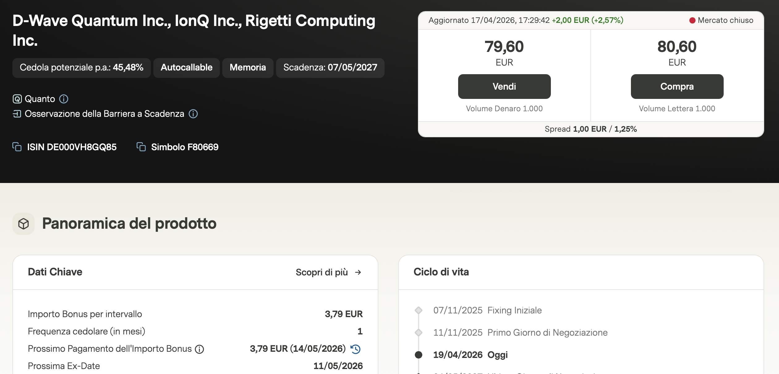 Per chi cerca rendimenti più aggressivi, il settore del Quantum Computing (ISIN DE000VH8GQ85) offre cedole del 3,79% mensile. Tuttavia, il prodotto è attualmente in modalità bid only a causa della forte volatilità di sottostanti come Rigetti. Sebbene l'ultima cedola non sia stata pagata, l'effetto memoria permette di recuperare i premi qualora i titoli tornino sopra barriera nelle prossime date di osservazione.