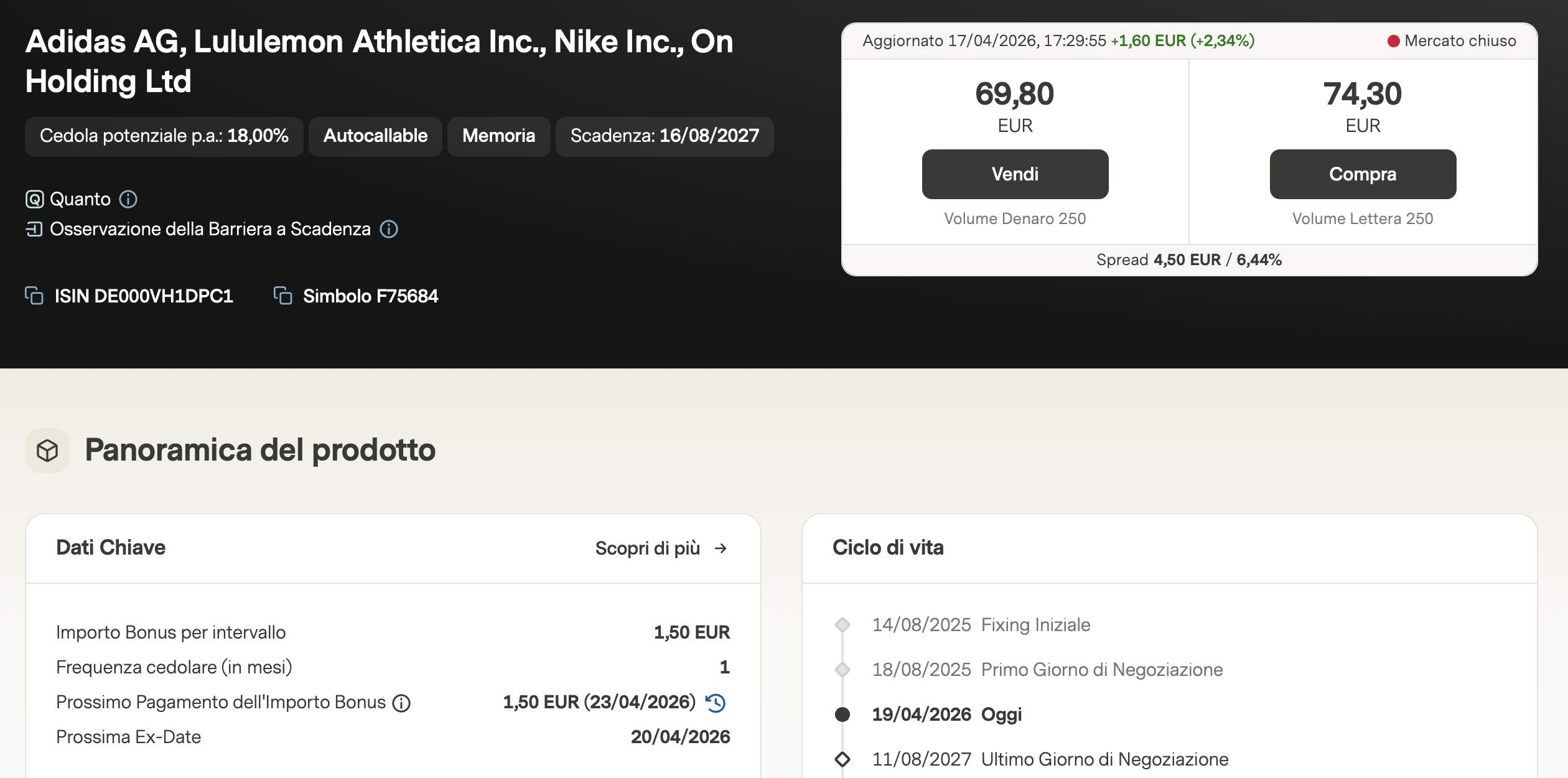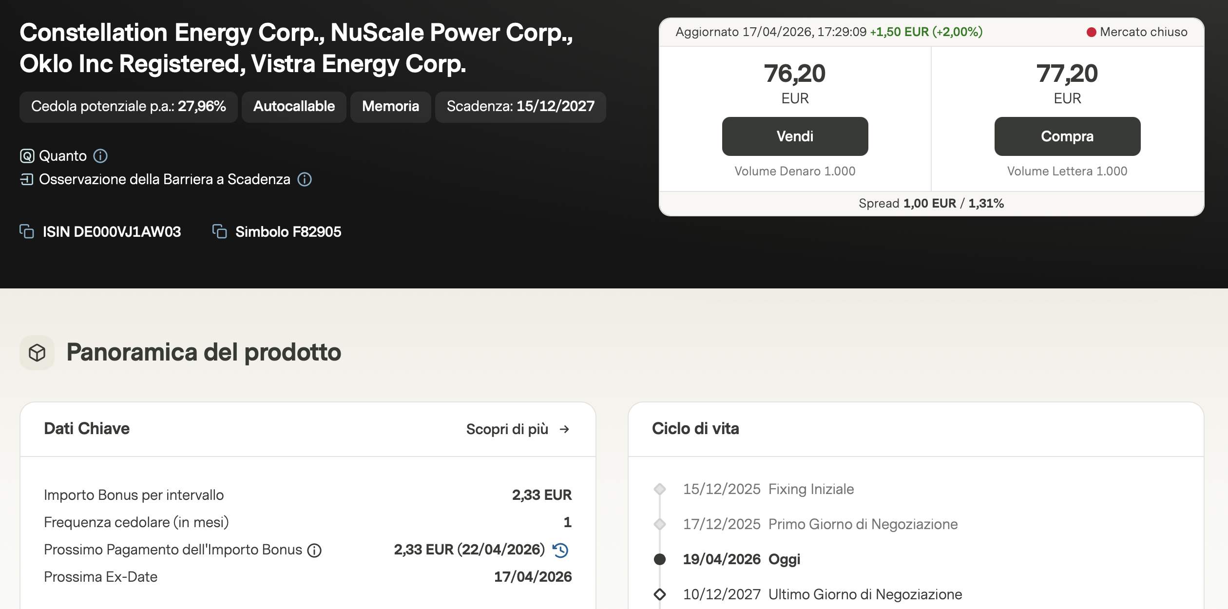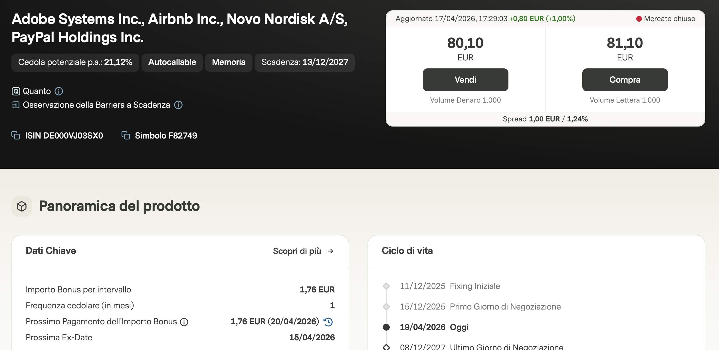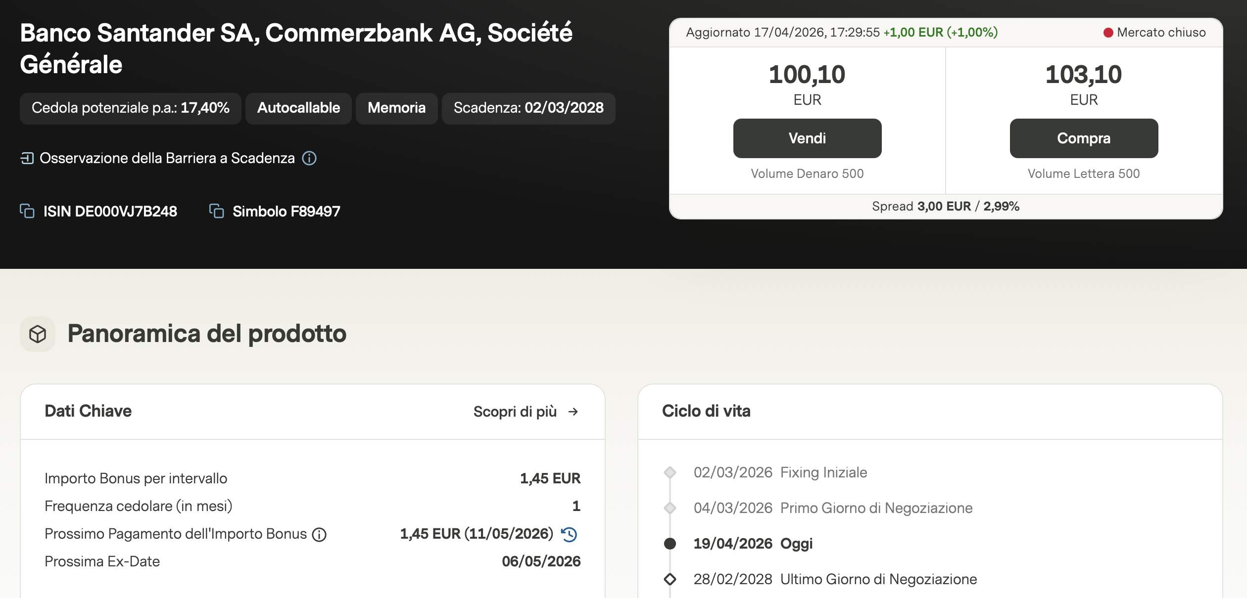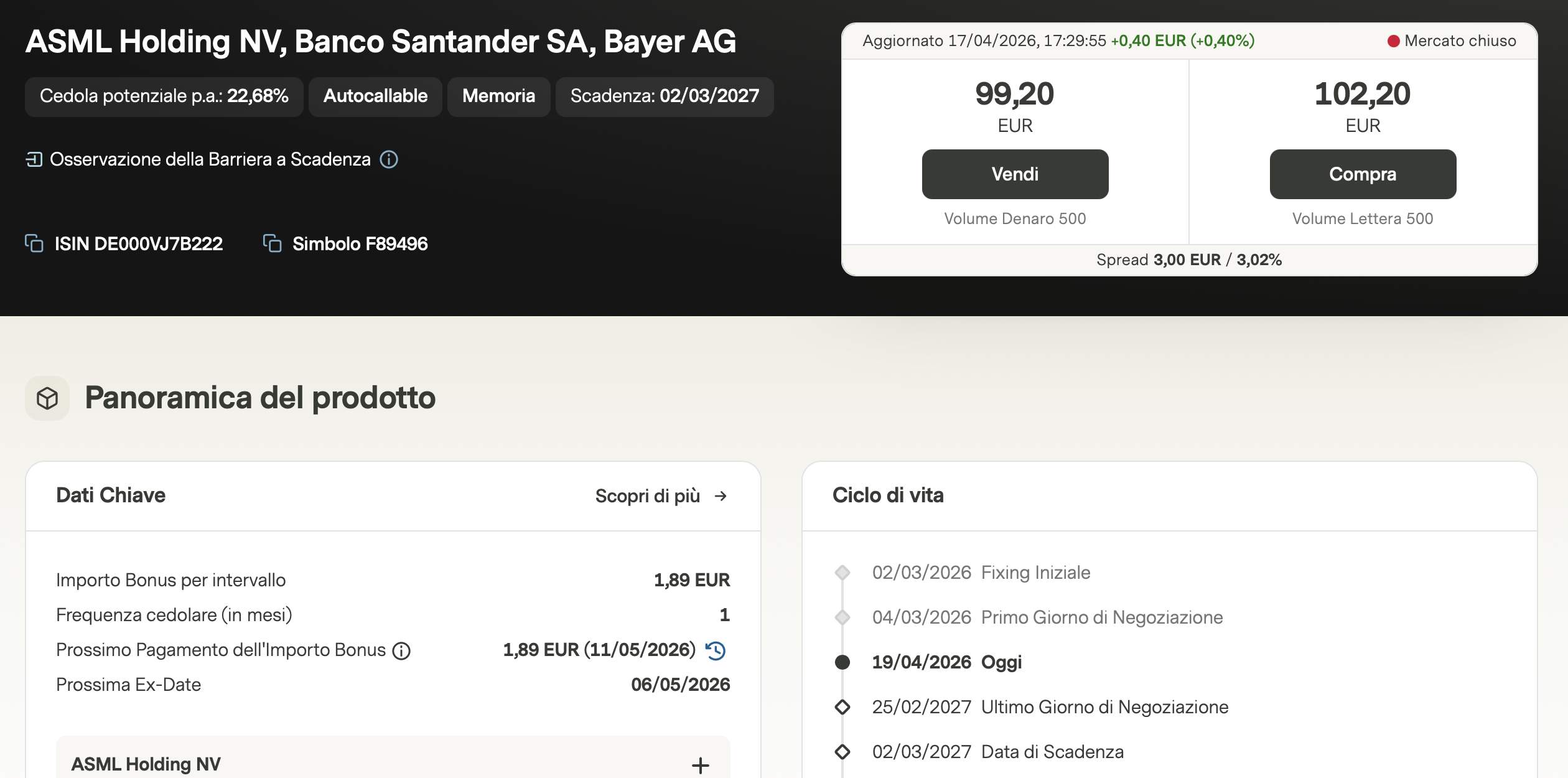 Un altro prodotto che ha attirato la nostra attenzione è il certificato Titoli Momentum EU (ISIN DE000VJ7B222), che ha appena staccato una cedola di 1,89€. Questo paniere include titoli che hanno sovraperformato il mercato, come Santander, ASML e Bayer. Nonostante Bayer si trovi leggermente sotto il livello di fixing, il prodotto mantiene un profilo interessante grazie alla possibilità di richiamo anticipato (autocall), che permetterebbe di incassare immediatamente il premio sulla quotazione sotto la pari (aggiornamento: al momento è già salita sopra la pari).
