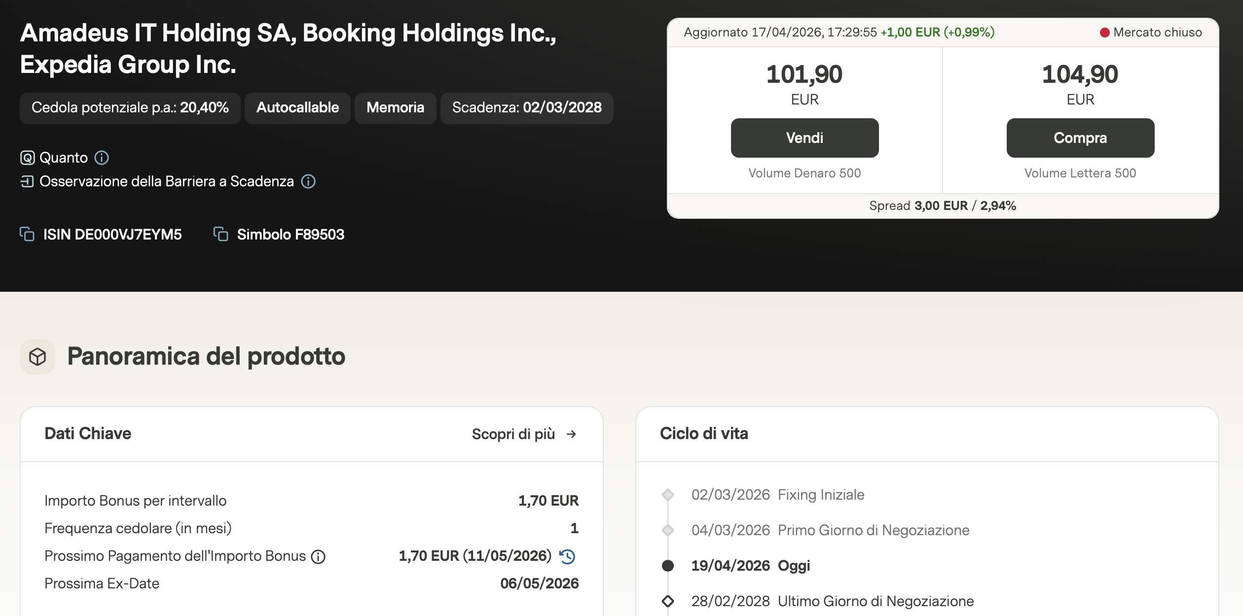 Un ruolo altrettanto cruciale è svolto da Amadeus, la società spagnola che fornisce l'infrastruttura tecnologica a oltre 400 compagnie aeree e milioni di hotel. Se Booking è la vetrina, Amadeus è il motore che permette alle vacanze di esistere. Acquistare questo certificato sotto la pari permette di esporsi a un settore in forte crescita con un rendimento potenziale molto elevato.