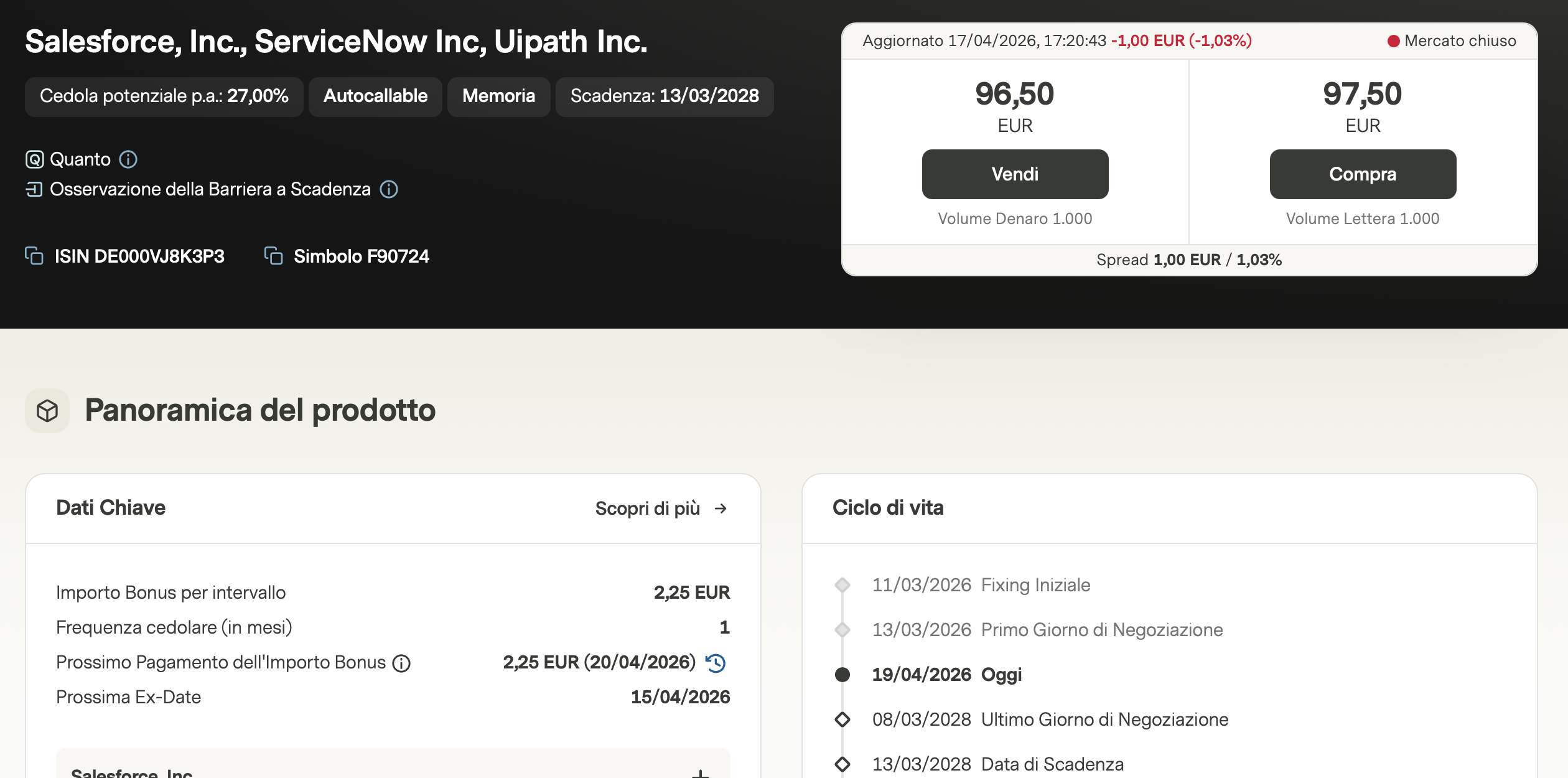 Un capitolo fondamentale di questo mese riguarda il certificato SaaS (Software as a Service) (ISIN DE000VJ8K3P3), che contiene titoli del calibro di Salesforce, ServiceNow e UiPath. Qui abbiamo già un rendimento in conto capitale perchè quota al momento intorno ai 97 euro, poi c'è anche un signor rendimento cedolare. Parliamo di un rendimento del 2,25% mensile, ovvero circa il 27% annuo.