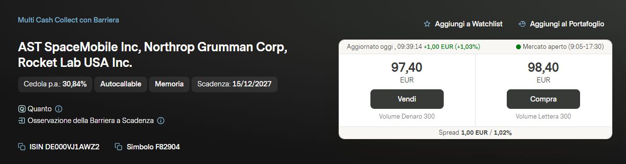 Inoltre, la struttura Quanto elimina il rischio di cambio, poiché i titoli sottostanti sono quotati in dollari USA. Nel complesso, si tratta di uno strumento pensato per chi desidera esporsi alla crescita della Space Economy, beneficiando di un profilo cedolare potenzialmente elevato e di una protezione condizionata del capitale, consapevole però della volatilità dei titoli e dei rischi legati a un settore ancora in forte evoluzione.