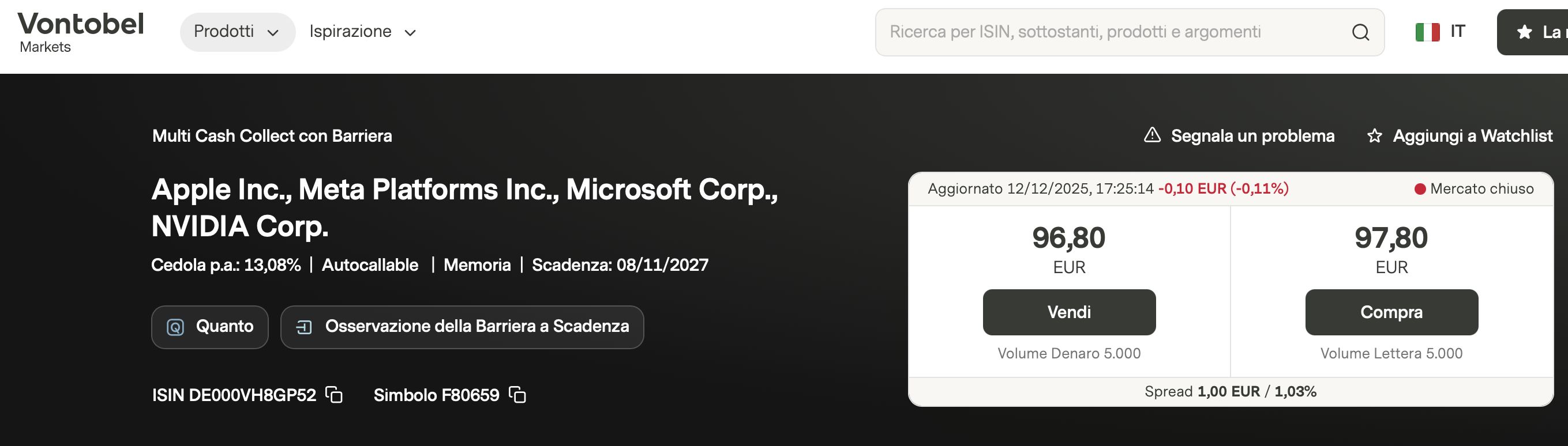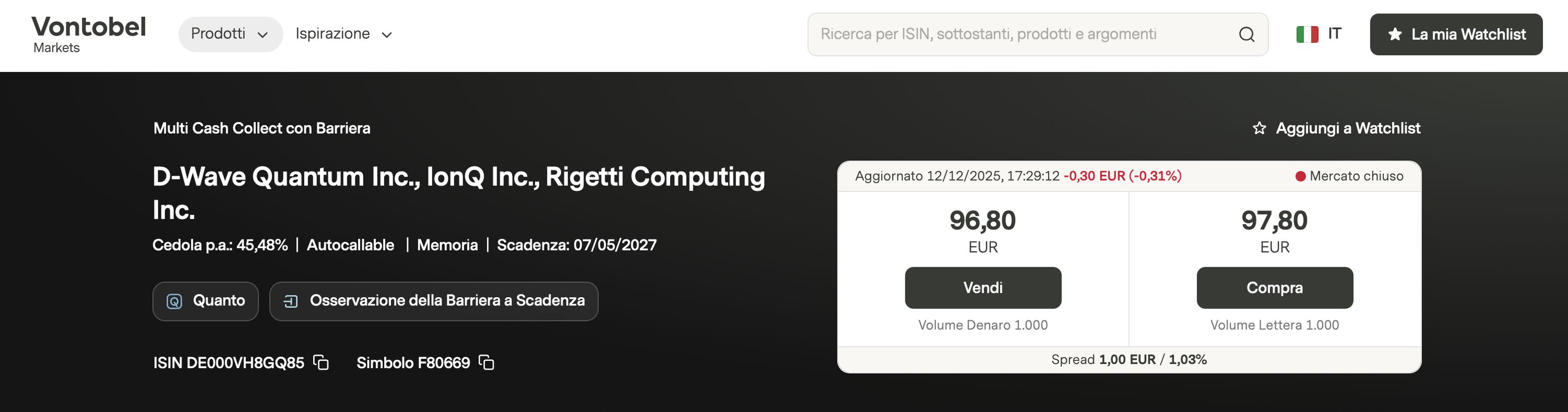 Il vero punto di forza di questo certificato è il momento in cui è stato strutturato. I titoli del settore, dopo un hype iniziale che ha portato Rigetti da 6 a 44 dollari, sono crollati tornando in area 10 dollari. Il certificato è stato emesso dopo questo schianto. Attualmente, nonostante Rigetti sia il titolo peggiore del paniere (Worst-Of), si trova ancora al di sopra della barriera del 45%. La strategia qui è chiara: con una scadenza a maggio 2027, non abbiamo bisogno che il titolo torni ai massimi. Ci basta che non perda un ulteriore 45% dai livelli attuali, un'ipotesi che consideriamo improbabile dato che le valutazioni attuali hanno già scaricato gran parte dell'ipercomprato. I dettagli li trovate tutti sulla sua pagina ufficiale del sito dell'emittente.