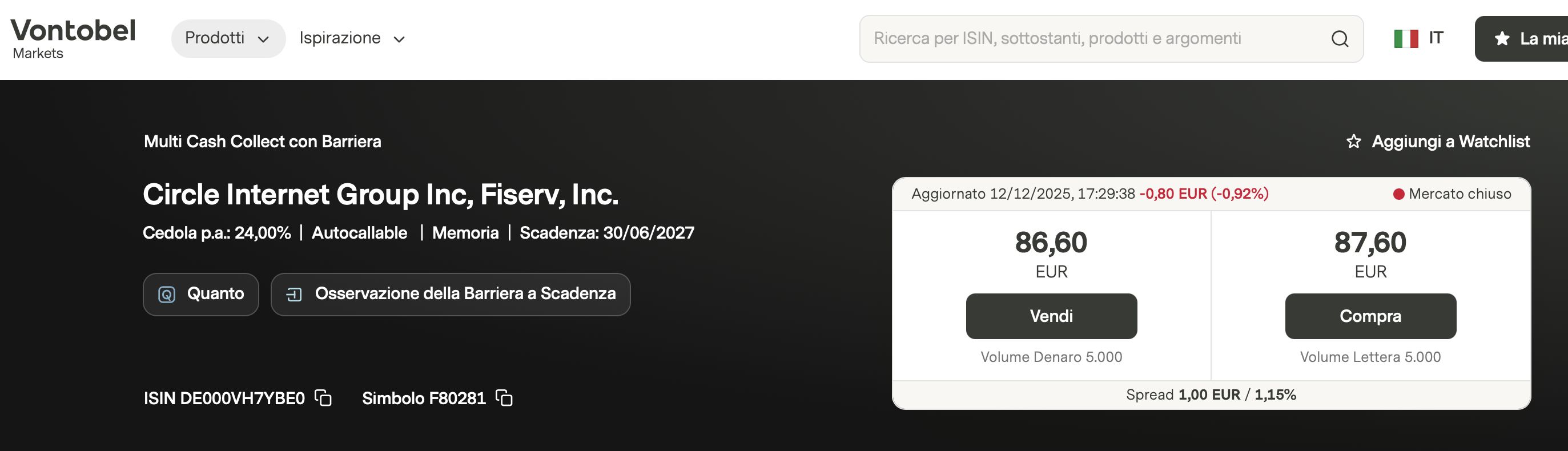 Le stablecoin, utilizzate in tutto il mondo (anche in paesi in via di sviluppo dove non arrivano Visa o Mastercard), canalizzano liquidità globale direttamente nel debito americano. È altamente improbabile che il regolatore USA affossi un settore che sta finanziando il loro deficit. Questo certificato si acquista in area 88, paga il 2% al mese (24% annuo) e ha barriere a 75 dollari con il titolo Circle che viaggia sopra gli 87. Un mix perfetto di rendimento e visione macro.