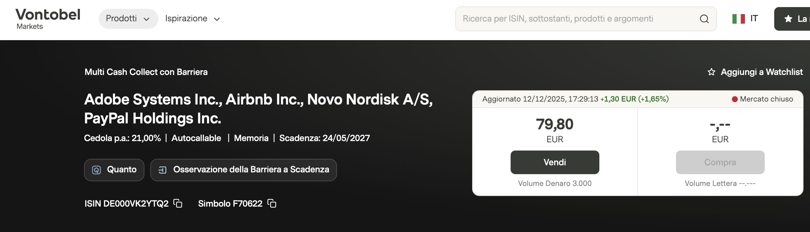 C'è un altro certificato che merita un'attenzione particolare, forse il più interessante per chi cerca un mix tra alto rendimento cedolare e forte apprezzamento del capitale. Il paniere è diversificato (Novo Nordisk, Adobe, PayPal, Airbnb) e offre un rendimento annuo del 21%, cioè 1,75% al mese (ISIN: DE000VK2YTQ2).