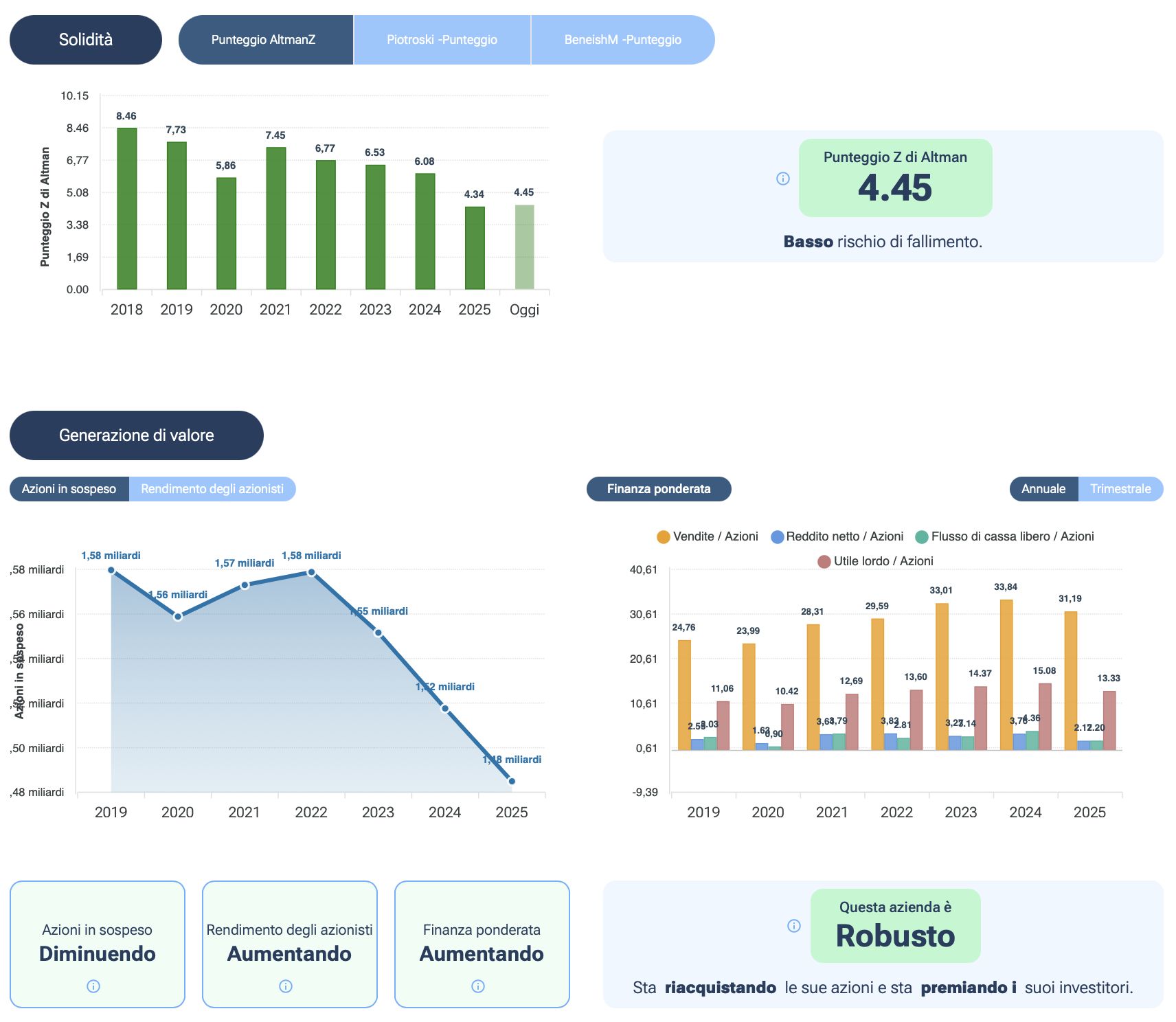Altman Z-Score: Il nostro algoritmo calcola un punteggio di 4,45, pienamente nella "Safe Zone" (sopra 2.99 non c'è rischio fallimento).