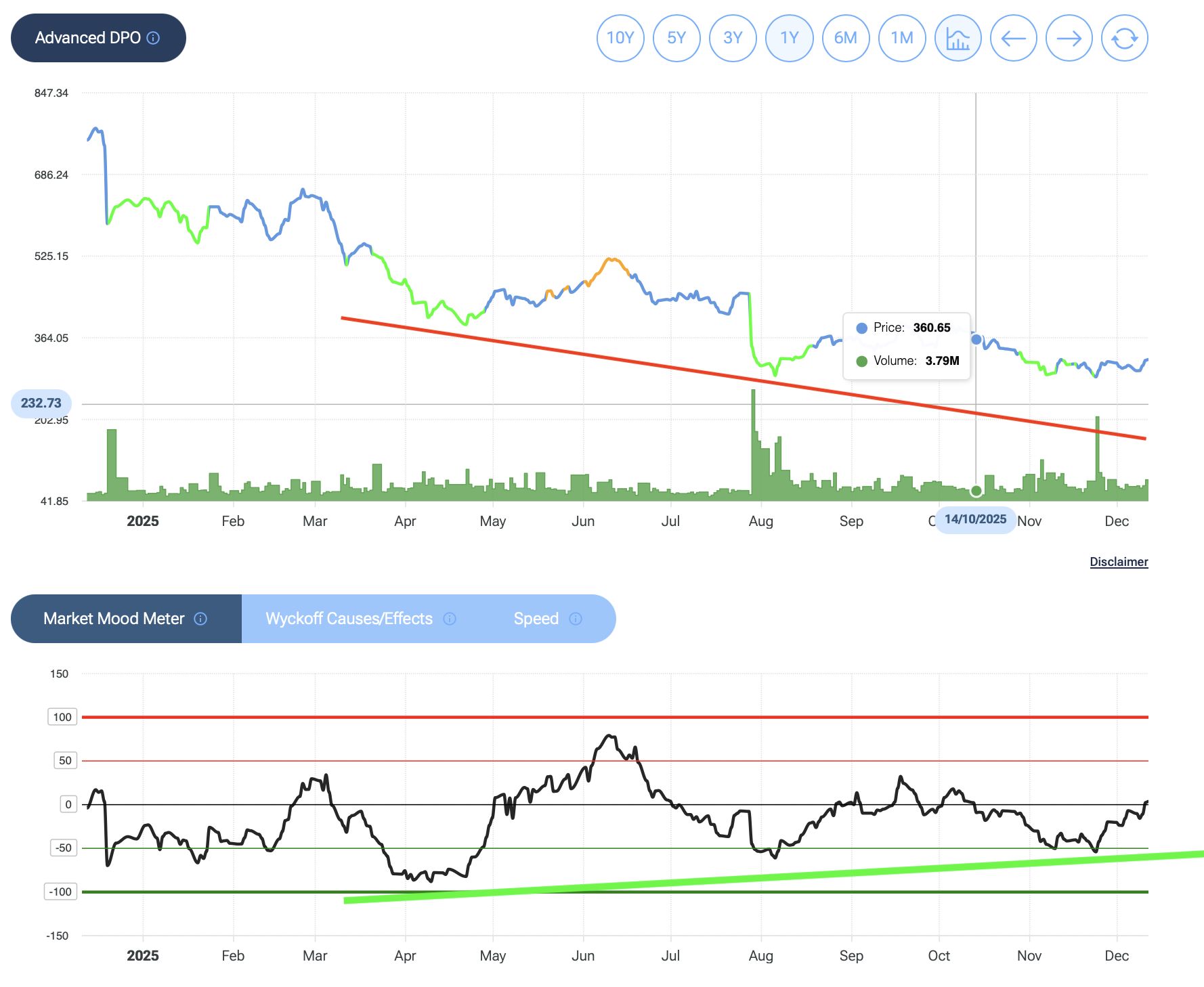 Analisi volumetrica: Il titolo sta scendendo con volumi decrescenti, ma sui minimi recenti abbiamo assistito a picchi di volume (in verde sul nostro indicatore), classico segnale che le "mani forti" stanno accumulando mentre il retail vende per panico.