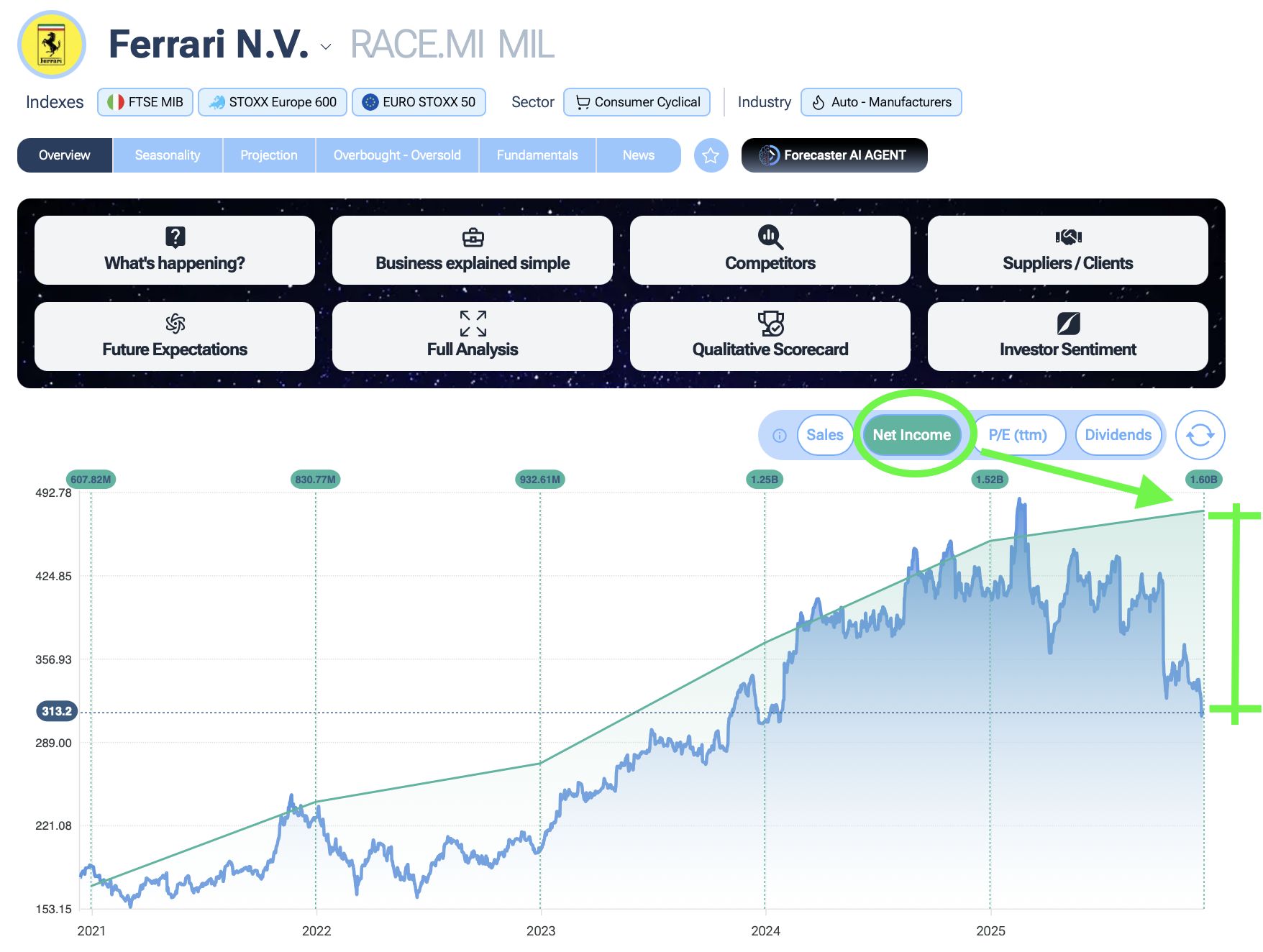 Storicamente, il prezzo delle azioni Ferrari segue fedelmente la linea degli utili. Recentemente si è creata una spaccatura: il prezzo è sceso, ma gli utili continuano a salire. Questo crea un'opportunità di acquisto "a sconto". L'azienda ha un punteggio qualitativo di 9 su 10 nel nostro Forecaster.