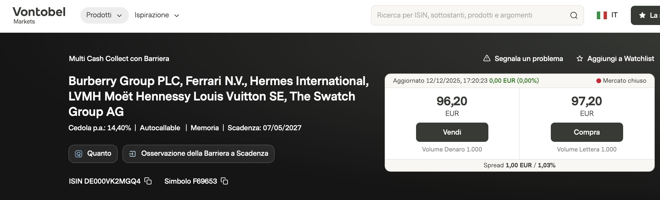 Il certificato sul lusso (Burberry, Ferrari, Hermes, LVMH, Swatch) paga l'1,20% mensile (ISIN: DE000VK2MGQ4). Qui l'anomalia di mercato è rappresentata da Ferrari, scesa da 480 a 340 euro.