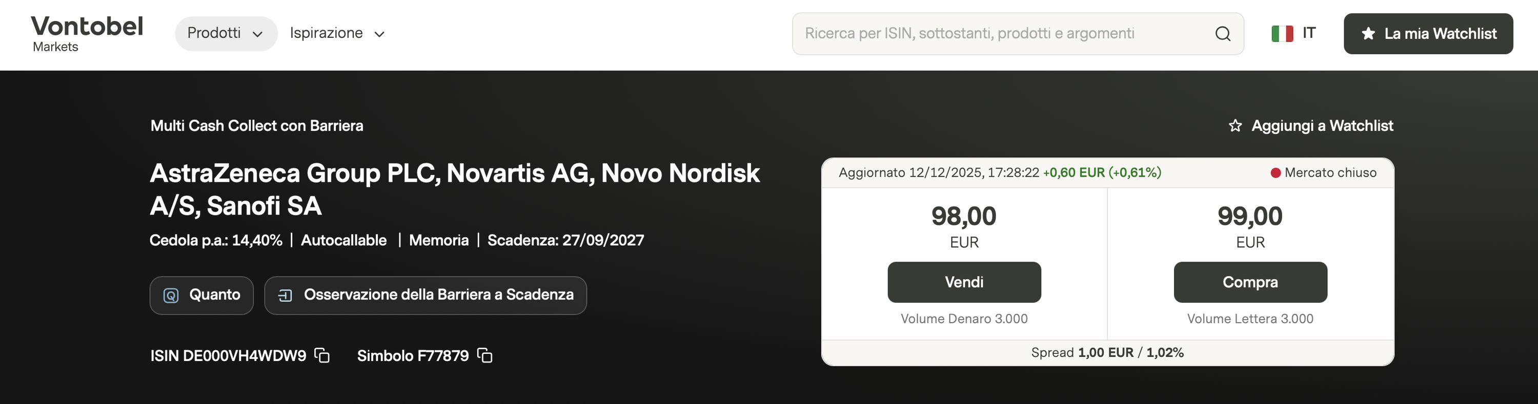 Passiamo a un comparto difensivo con il certificato sui colossi farmaceutici (tra cui Sanofi e Novo Nordisk). Questo strumento paga un 1,2% al mese ed è ideale per chi cerca solidità (ISIN: DE000VH4WDW9).