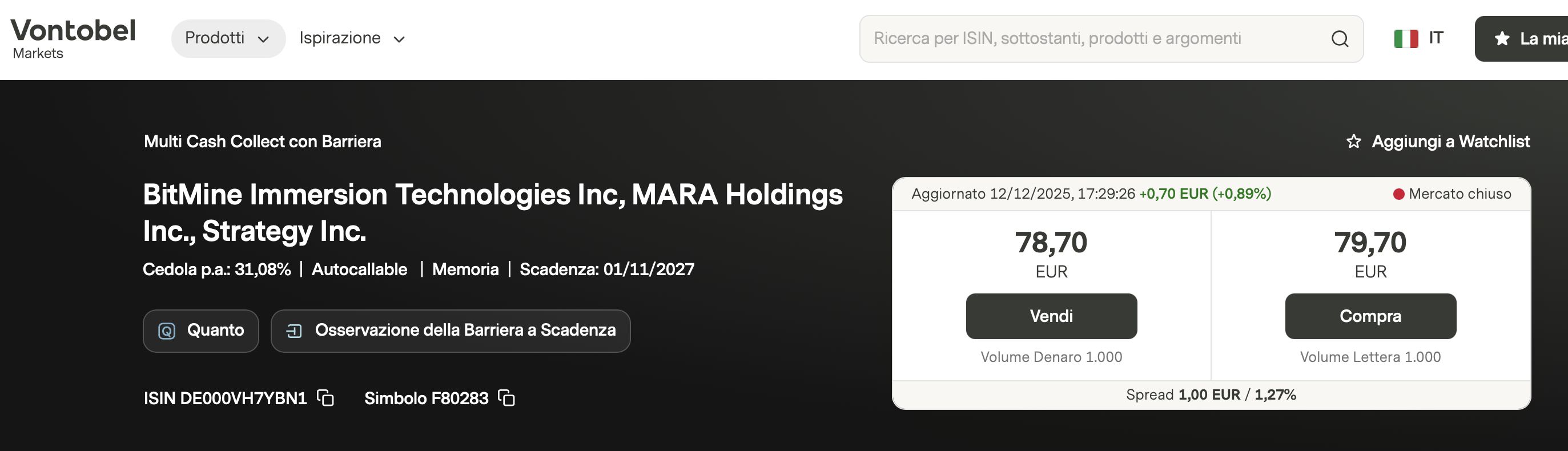 Questi titoli sono leve sul prezzo del Bitcoin. Quando BTC scende, questi titoli crollano ancora di più (Strategy è arrivata ad avere una capitalizzazione inferiore al valore dei Bitcoin che possiede in pancia). Il certificato si acquista a prezzi di saldo, intorno a 80 euro (ISIN: DE000VH7YBN1).
