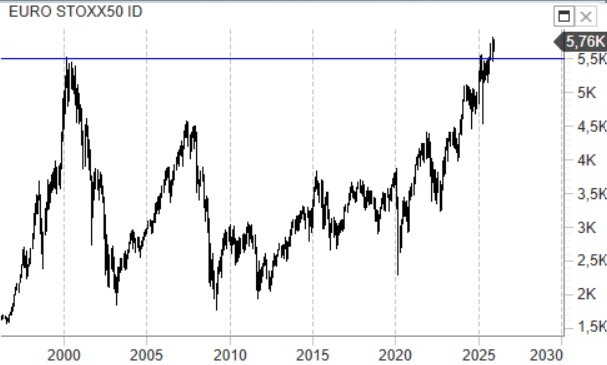 L’indice EuroStoxx50 è fresco reduce dal superamento dei massimi storici del 2000 quando la bolla speculativa sulle telecom e la tecnologia in genere fece decollare un indice che ci ha messo un quarto di secolo per recuperare quelle quotazioni.