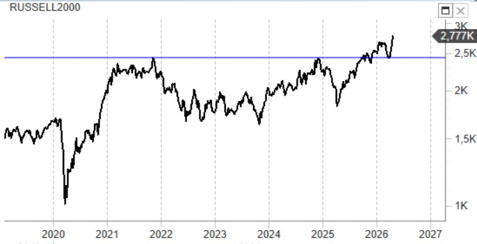 Come si vede dal grafico dell’indice Russell 2000 in USD, i massimi del 2021 hanno fatto da argine anche nel 2024 prima di un definitivo strappo all’insù maturato a fine 2025. Un movimento che successivamente ha visto un pull back per l’attacco all’Iran da parte di Stati Uniti e Israele, seguito ora ora da una ripartenza che sembra mettere in chiaro le intenzioni di un mercato desideroso di uscire da questa fase di stallo.