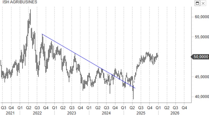 Osservando il grafico dell’ETF iShares Agribusiness si nota come il Liberation Day abbia liberato l’energia necessaria per far uscire il settore da un limbo nel quale era entrato, senza più uscirne, dal 2022 in avanti.