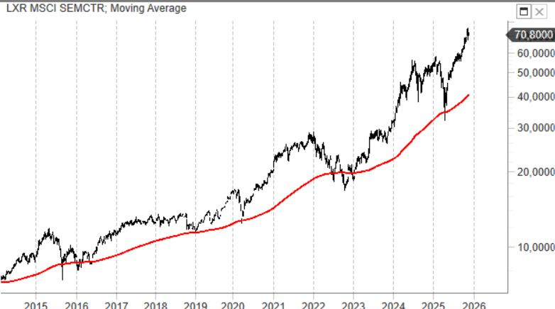 Graficamente non ci sono molti dubbi sul fatto che i tentennamenti del 2024 e dei primi mesi del 2025 sono stati ampiamente superati dall’ETF di Amundi che, in occasione del Liberation Day di aprile, ha offerto una clamorosa finestra di acquisto andando a testare la media mobile a 200 settimane.