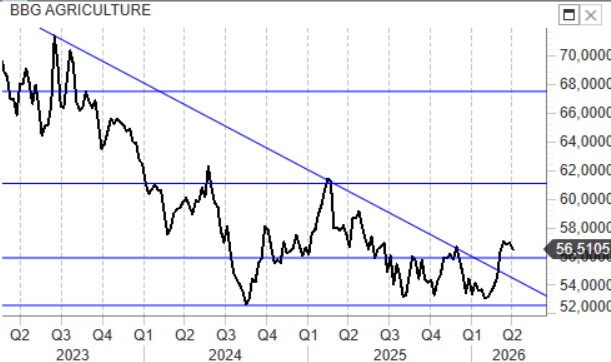 Il grafico del Bloomberg Agriculture ci mostra infatti un indice che tra il 2024 e il 2025 ha continuato a picchiare su una zona di supporto poco sopra il 61,8% di ritracciamento del rialzo partito dopo la pandemia nel 2020. Poi c'è stata una bella reazione tuttora in corso.