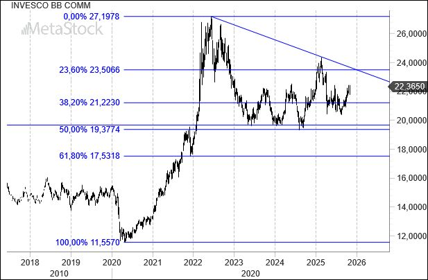Se il rialzo appena abbozzato nelle ultime settimane dovesse sfondare verso l’alto la trend line che unisce i massimi del 2022 e di inizio 2025, allora si aprirebbero prospettive veramente interessanti per le commodity, ancora ben lontane dai massimi di inizio secolo. A quel punto una asset class che meriterebbe qualche punto percentuale di peso in più.