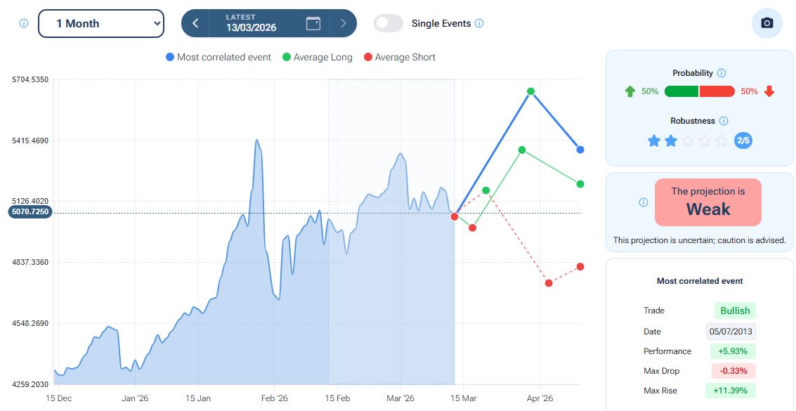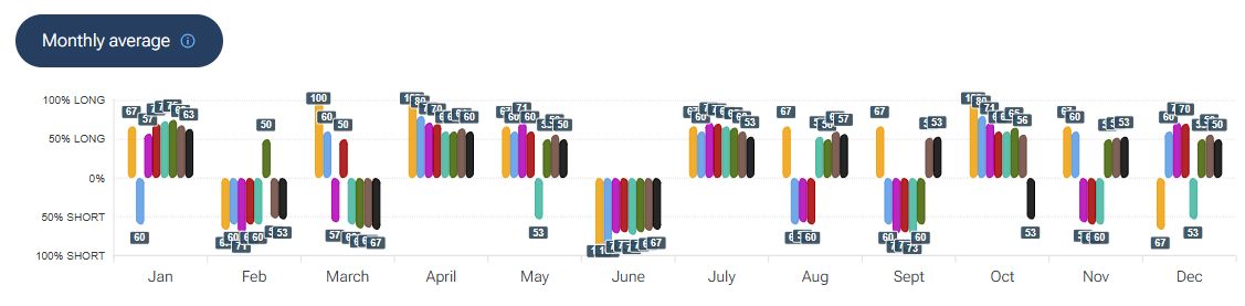 Per quanto riguarda la stagionalità - analizzata con la piattaforma Forecaster - gli archi temporali selezionati mostrano un potenziale rialzo fino alla fine della prima decade di aprile, seguito da una fase di lateralità/debolezza che potrebbe estendersi fino a fine giugno.