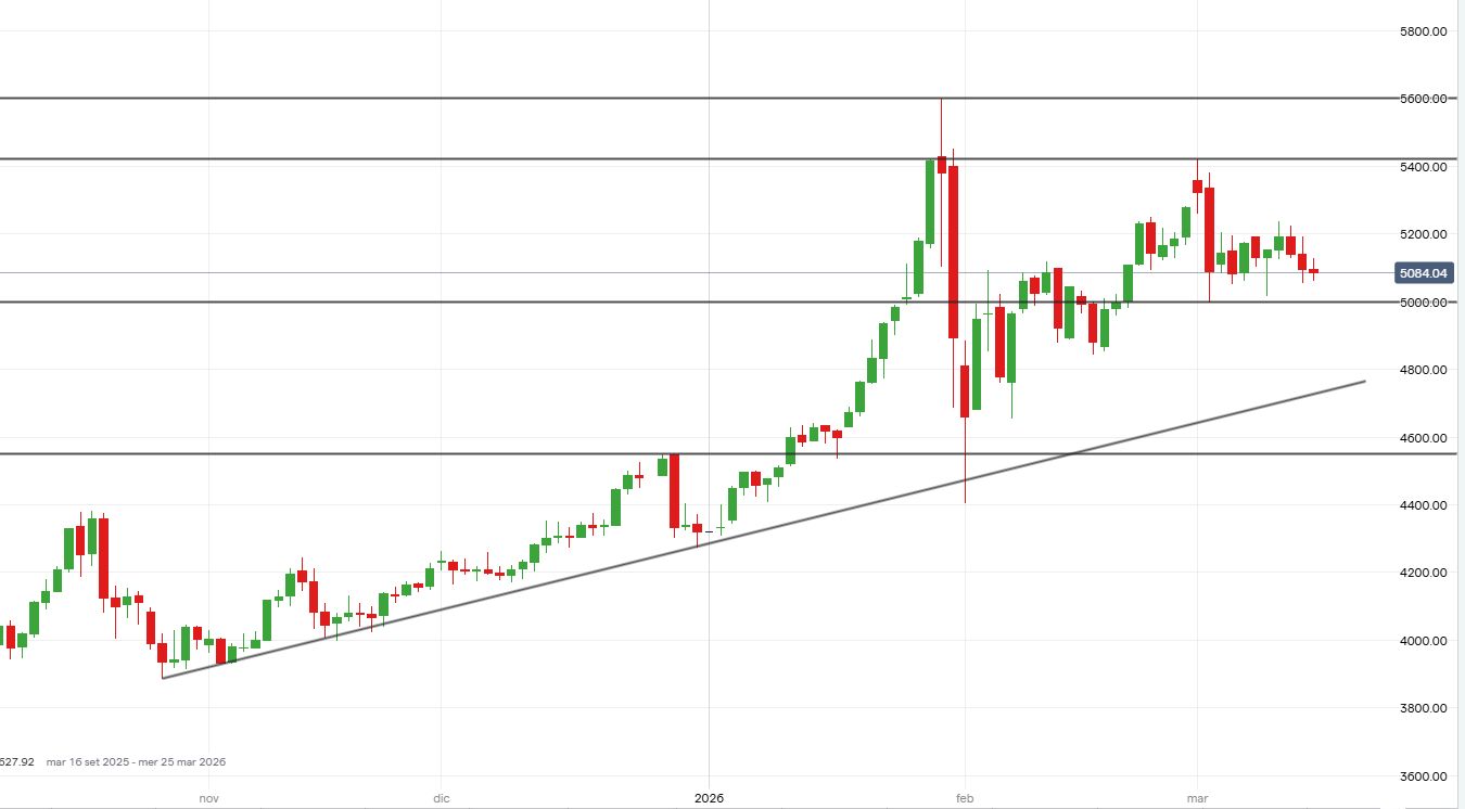 Le quotazioni dell’oro cedono terreno e rimangono all’interno dell’area di consolidamento compresa tra i livelli orizzontali a 5.000 e 5.230 dollari l’oncia. Con la difesa di area 5.000 dollari, il quadro grafico di breve rimarrà orientato al rialzo, con possibili target in prossimità dell’area di resistenza compresa tra i 5.420 e i 5.600 dollari.