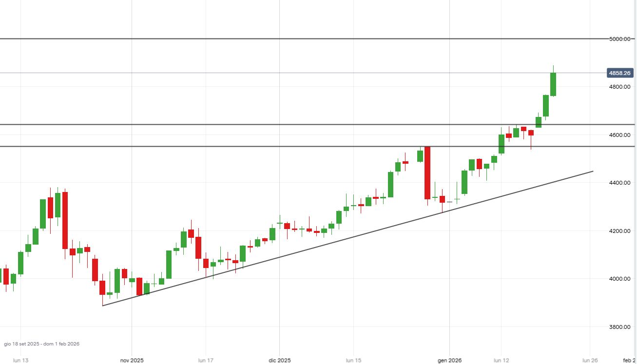 Si potrebbero dunque valutare strategie long in caso di ritracciamento e conseguenti segnali di inversione nei pressi dell’area di supporto compresa tra i livelli orizzontali a 4.643-4.550 dollari l’oncia. In tal caso il primo obiettivo di breve termine potrebbe essere posto in area 4.900 dollari e il successivo a 5.000 dollari l’oncia.