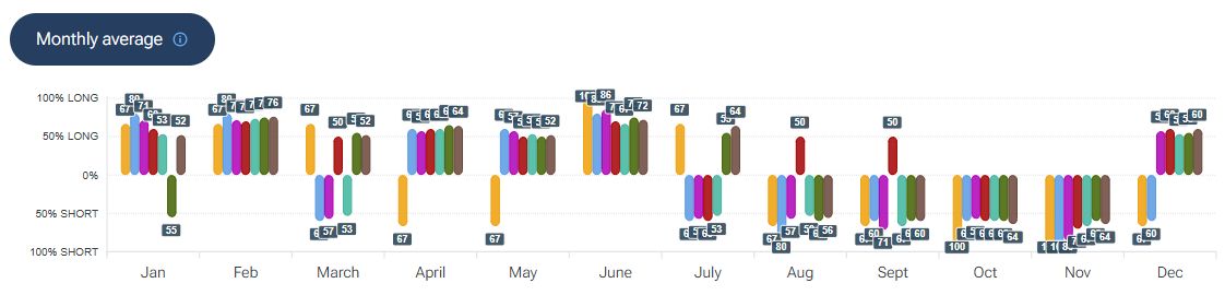 Per quanto riguarda la stagionalità - analizzata con la piattaforma Forecaster - gli archi temporali selezionati mostrano una possibile fase ribassista che potrebbe estendersi fino alla fine della seconda decade di marzo, seguita da una possibile ripartenza al rialzo che potrebbe durare fino a fine maggio.