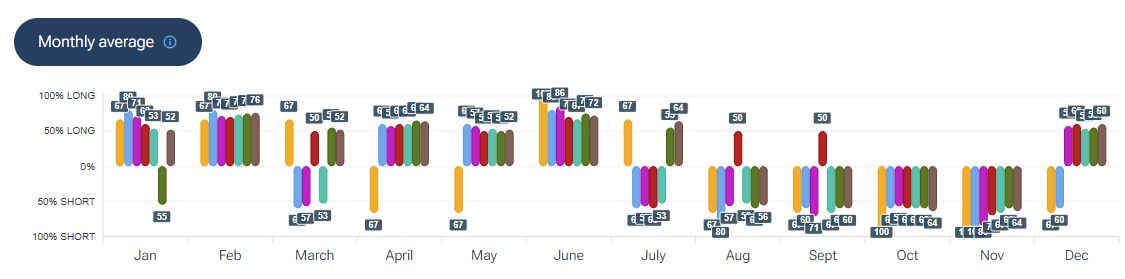 Per quanto riguarda la stagionalità - analizzata con la piattaforma Forecaster - gli archi temporali selezionati mostrano una possibile fase di ribasso fino all’inizio della prossima settimana, seguita da una possibile fase rialzista che potrebbe estendersi fino ai primi giorni di luglio.