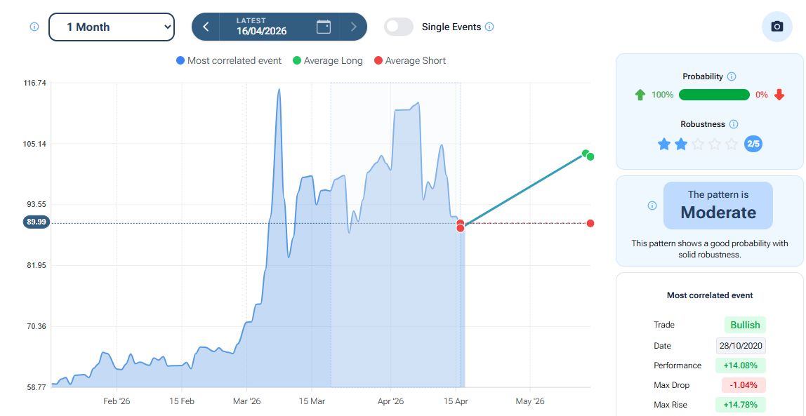 Il tool “Pattern” della piattaforma Forecaster, con orizzonte temporale a 1 mese, evidenzia negli scenari “best match” (linea blu) e “long” (linea verde) un possibile rialzo che porterebbe i prezzi in area 103 dollari al barile, prima di un eventuale storno (guarda come funziona il tool “Pattern” di Forecaster Terminal).