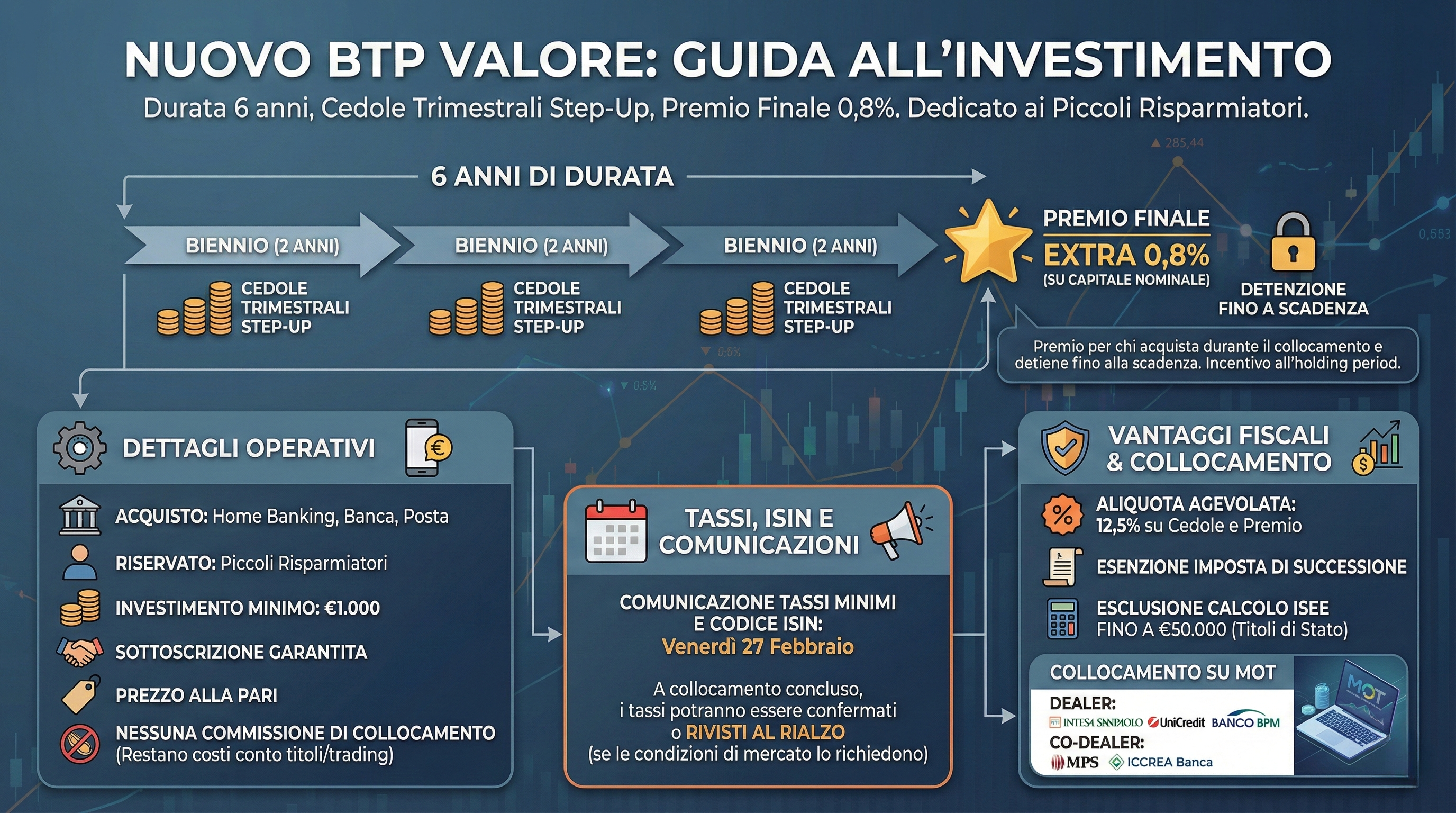 Il nuovo BTP Valore avrà durata di 6 anni e pagherà cedole ogni tre mesi, con meccanismo step-up articolato su tre bienni (2+2+2). Il “premio finale extra” per chi ha acquistato durante il collocamento e deterrà fino alla scadenza sarà pari allo 0,8% del capitale nominale investito (un elemento che incentiva l’holding period più che il trading).