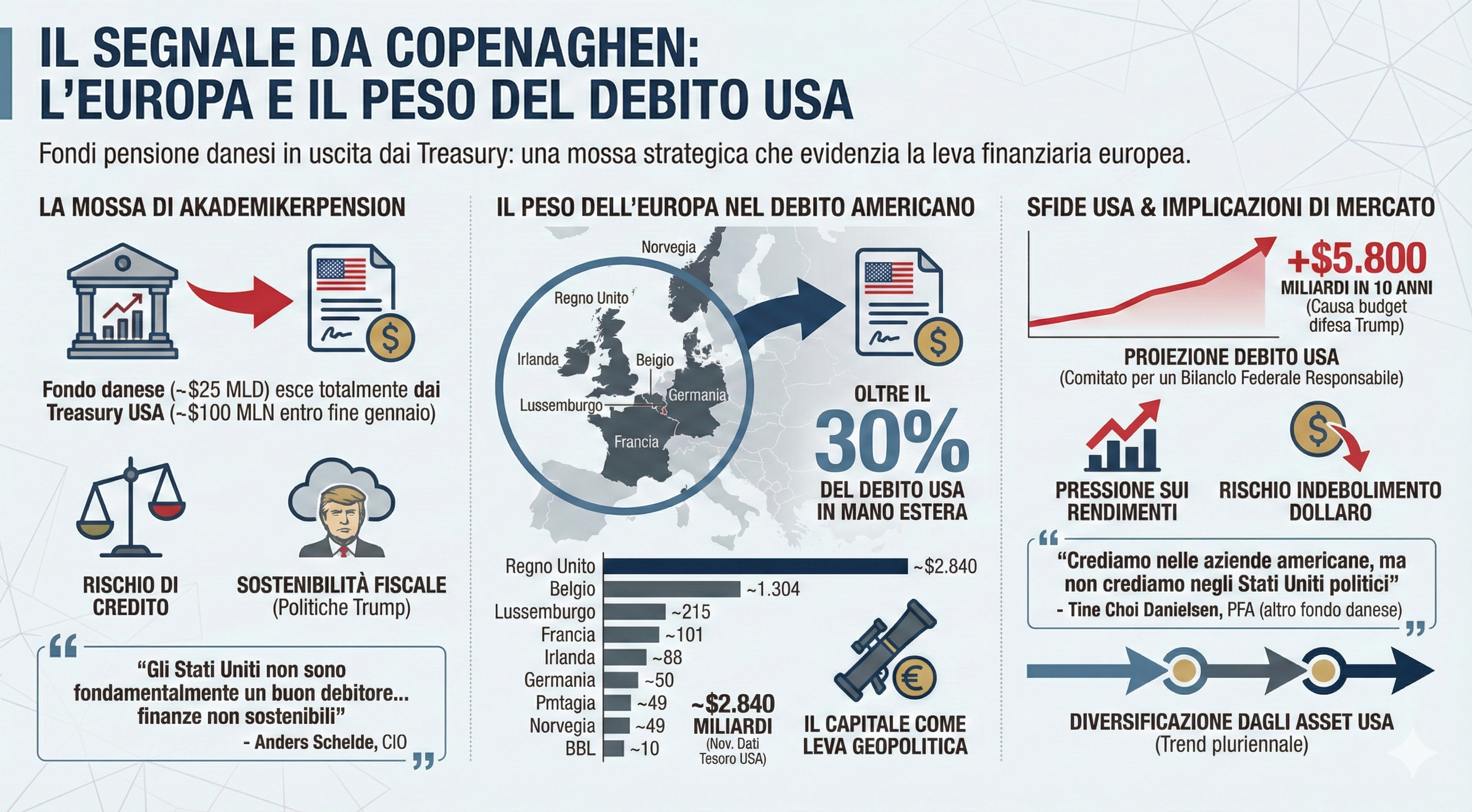 L'AkademikerPension, fondo pensione danese da circa 25 miliardi di dollari, ha deciso di uscire del tutto dai Treasury USA: una mossa piccola nei numeri, ma potente nel segnale politico-finanziario. Il punto, per gli investitori europei, è che il “peso” dell’Europa sul debito americano è enorme e potrebbe diventare leva in un clima geopolitico sempre più teso.